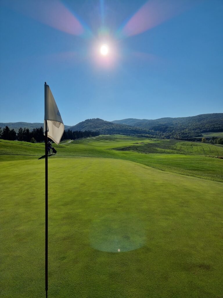 Die Wahl des Signature-Hole fällt schwer, ist der Platz insbesondere auf der Back-Nine mit vielen interessanten Löchern ausgestattet. Die Wahl fällt auf die Spielbahn 12, ein langes PAR 5 mit 547 Metern vom Herrenabschlag und 470 Meter für die Damen. Abschlagsboxen wie eine Kanzel, von der man den Ball dramatisch in das lange Tal hinab schlägt. Die Fairway-Bunker kommen nur für die Longhitter ins Spiel. Dafür sind die Grünbunker links und rechts des Grüns bei langen Annäherungen eine Gefahr. Das schnelle Grün ist teilweise so stark onduliert, dass ein falsch gelesener Putt wieder vom Grün rollen kann. Genau das ist mir tatsächlich passiert, trotz Green in Regulation, musste das Bogey mit einem guten Chip schwer erkämpft werden. Den Abschluss nach 18 Loch bildet ein echtes 19. Loch, dass sogenannten „Brunello-Loch“, ein kurzes PAR 3, perfekt zur Entscheidung eines geteilten Matches oder zum Ausspielen des Getränks auf der Club-Terrasse. Die Bezeichnung des Extra-Lochs steht für den in der Weingegend typischen Brunello-Rotwein, der die perfekte Überleitung zum Weingut von Castiglion del Bosco darstellt.