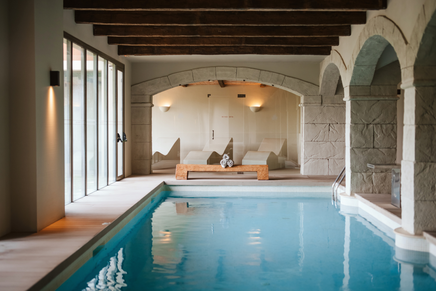 Der Wellness-Bereich Wine & Spa zeigt deutlich den Bezug zum Wein in seinen Anwendungen, werden doch Trauben und Weinprodukte verwendet. In Räumlichkeiten, die vom Stil her an altrömische Badekultur bis hin zu einem mittelalterlichem Kloster erinnern, können sich Körper, Geist und Seele sich in völliger Harmonie in einer Oase voller Sensationen und Entspannung vereinen. Ein Außenpool und Fitness-Raum runden das Angebot ab.
