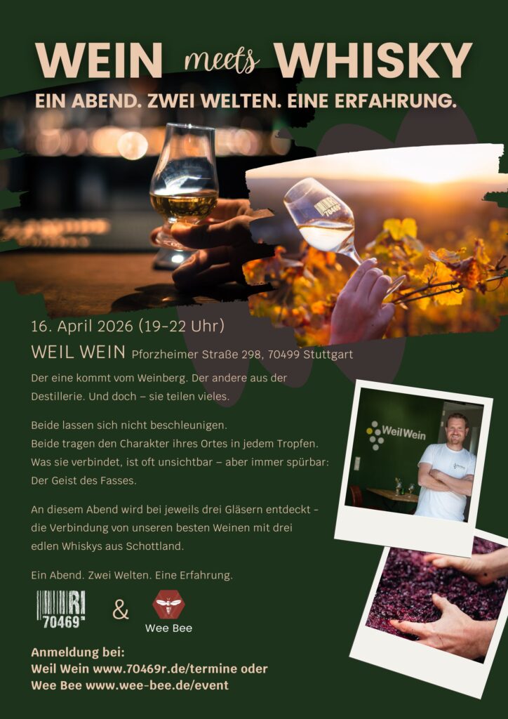 Ein besonderes Highlight ist bestimmt Wein meets Whisky am donnerstag, 16. April 2026 von 19 – 22 Uhr.