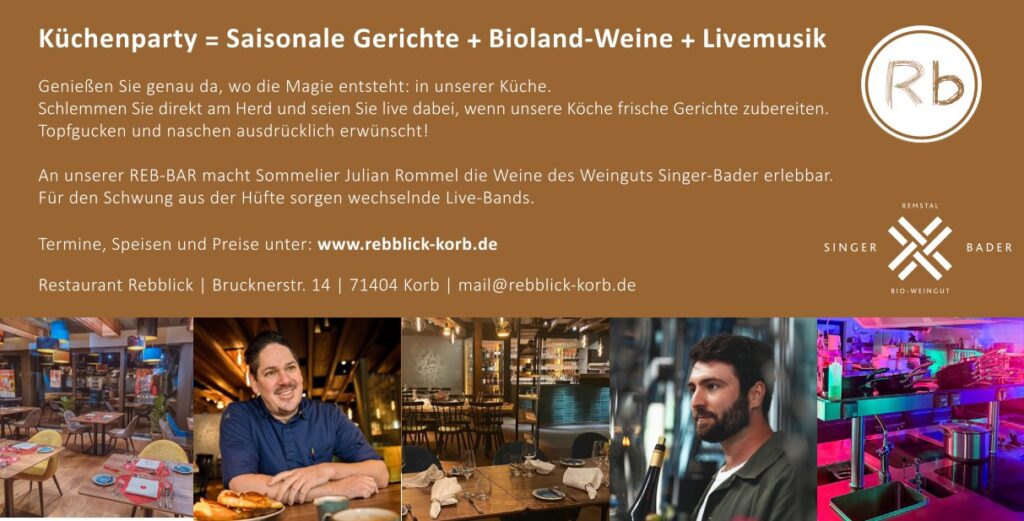 Genussfreunde dürfen sich auf einen besonderen Abend freuen: Am Donnerstag, 26. März 2026, lädt das Restaurant Rebblick in Korb ab 19 Uhr zur ersten Küchenparty des Jahres ein. Die Gäste erleben den kulinarischen Abend dort, wo sonst nur das Küchenteam arbeitet – direkt am Herd. Während die Köche verschiedene Gerichte live zubereiten, können Besucherinnen und Besucher den Küchenprofis über die Schulter schauen, ins Gespräch kommen und sich durch die Speisen probieren.