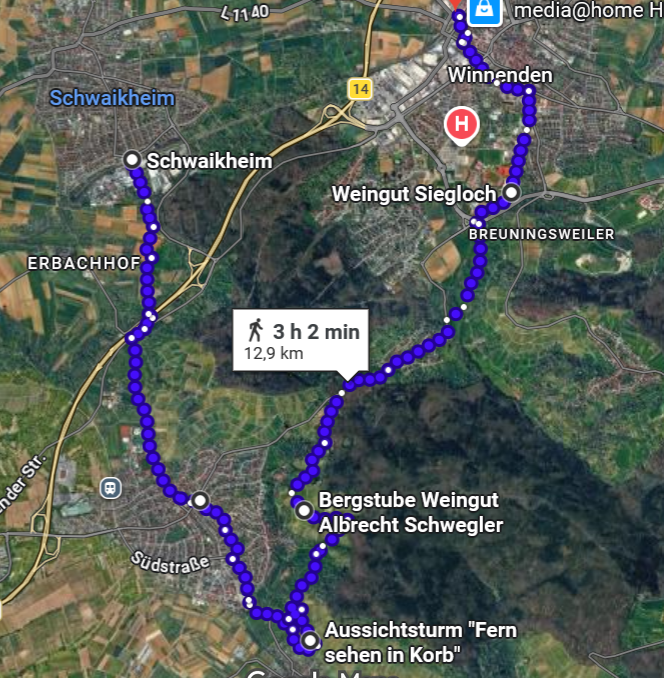 Weinwanderung von der S-Bahnhaltestelle Schwaikheim zum Weinkorb des Weingut Singer-Bader in Korb. Weiter über den Großheppacher Kopf zum Bergstüble des Weinguts Albrecht Schwegler am Fuße des Korber Hörnlekopfs. Von dort über den Hanweiler Sattel nach Winnenden in die neue Vinothek des Weinguts Siegloch. Vom S-Bahnhof Winnenden geht es dann wieder nach Hause.
