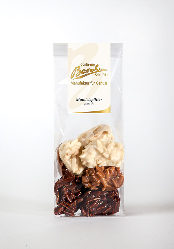 Mandelsplitter gemischt mit Vollmilch- dunkler- und weißer Schokolade überzogen